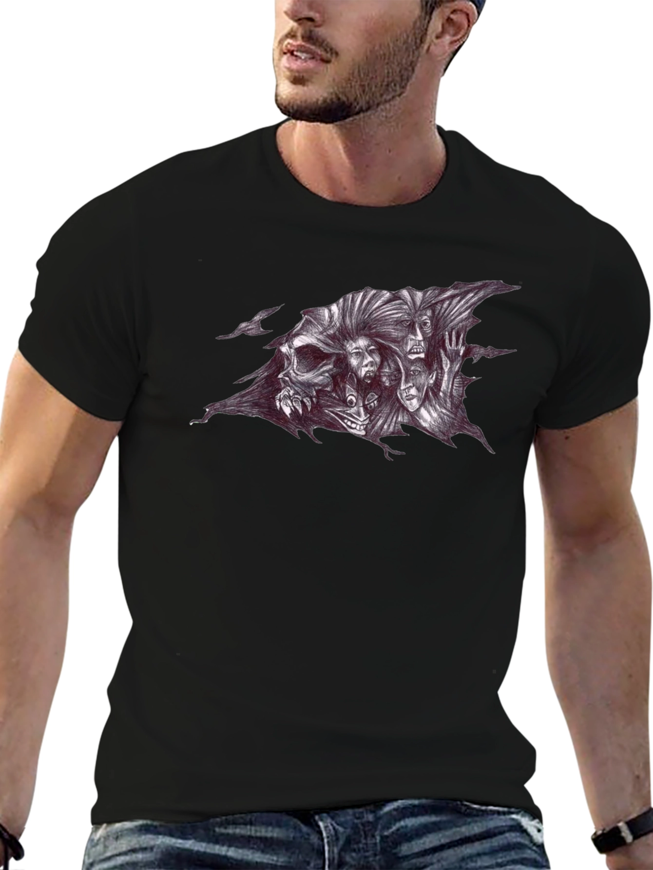 Make a statement with this bold graphic black t-shirt. This shirt features a striking design of skulls and spirits, rendered in intricate detail. The monochromatic artwork creates a visually compelling focal point on the classic black tee. Crafted from a soft, comfortable fabric, this tee is perfect for everyday wear. Whether you're a fan of edgy style or simply want to add some visual interest to your wardrobe, this skull and spirits t-shirt is an excellent choice. Pair it with jeans for a casual look, or dress it up with a blazer for a night out. This unique tee is sure to turn heads and spark conversation.