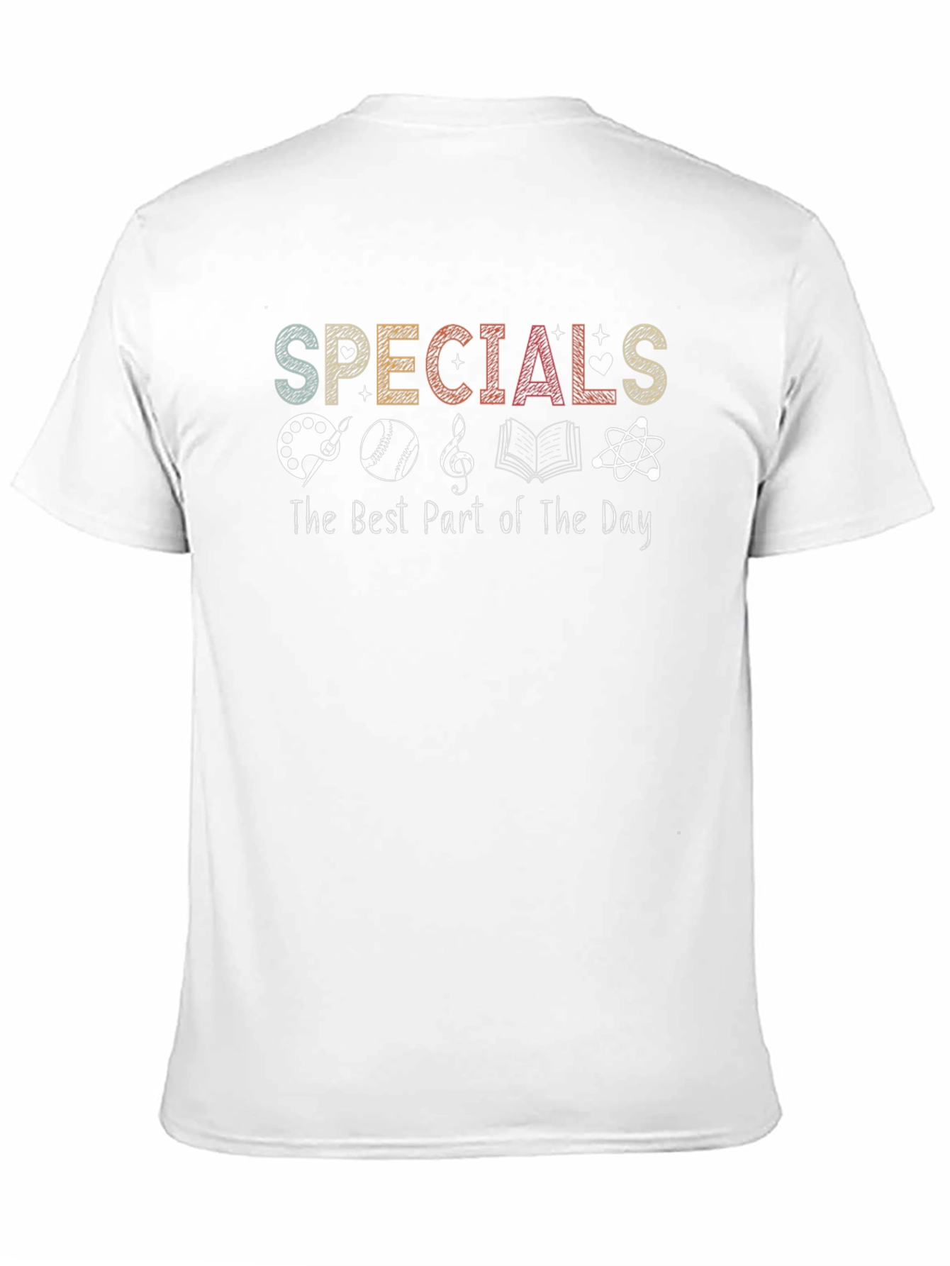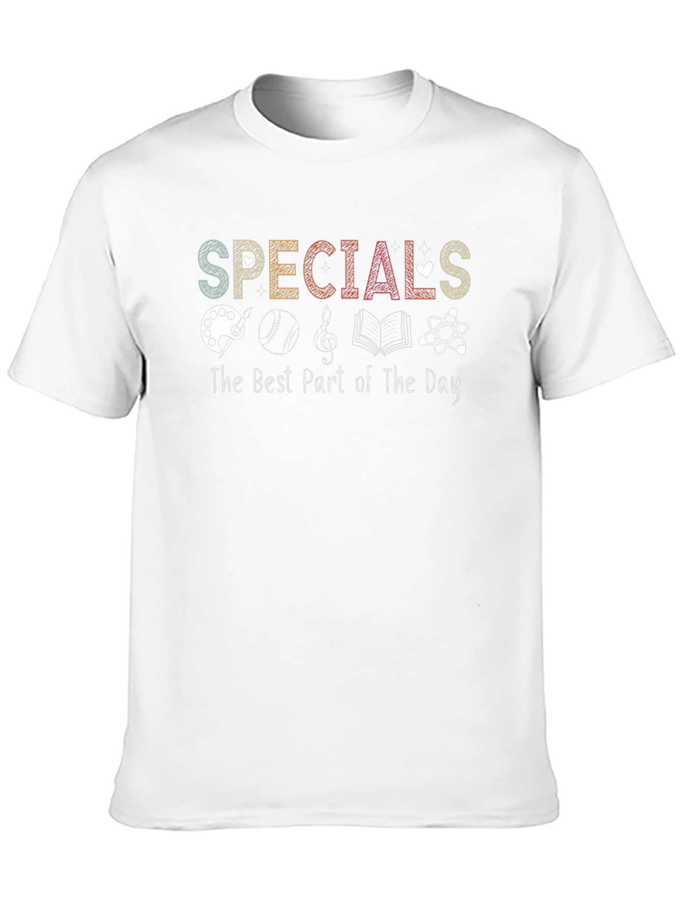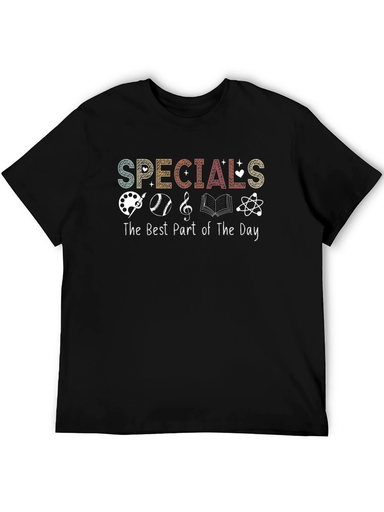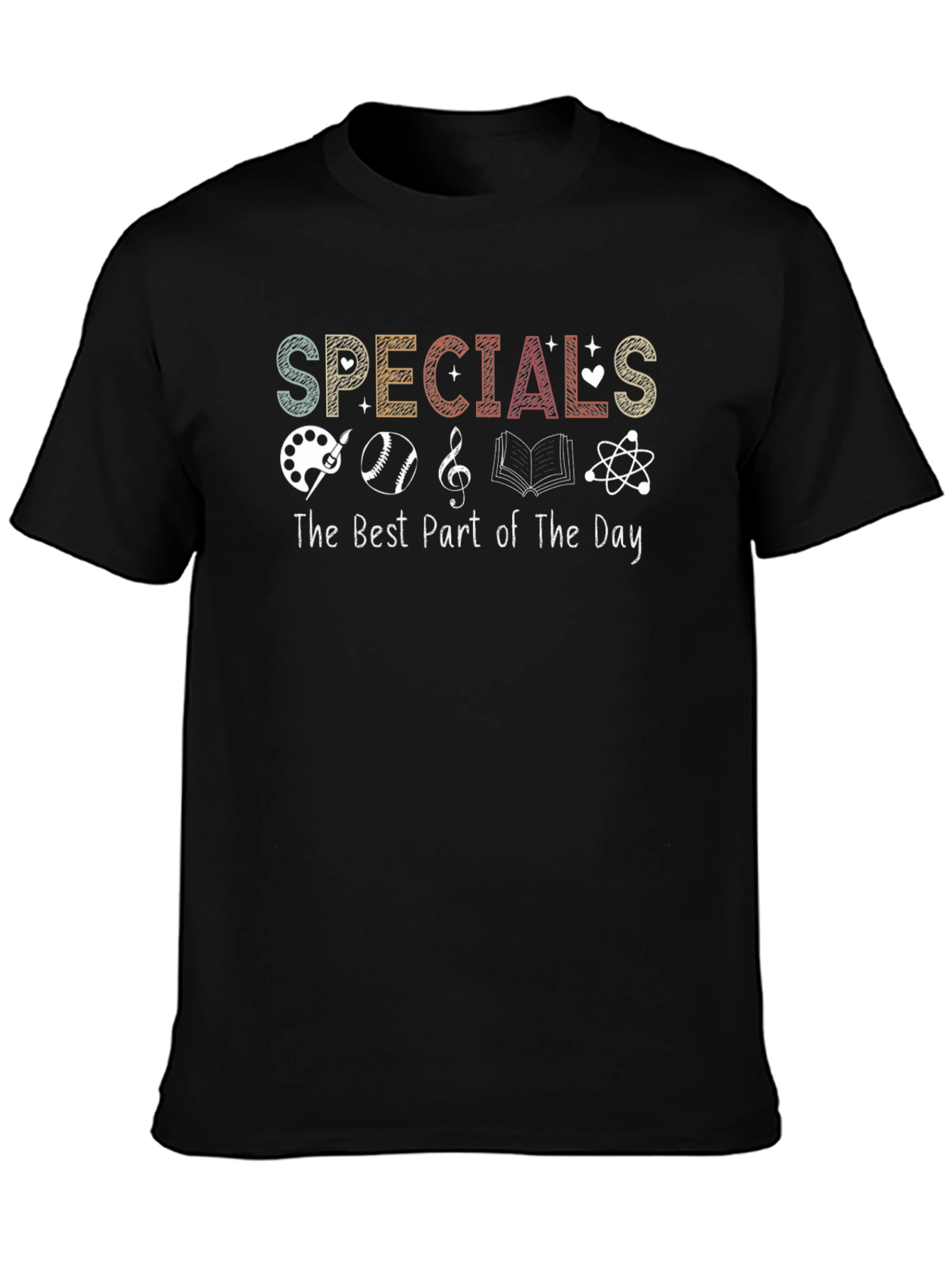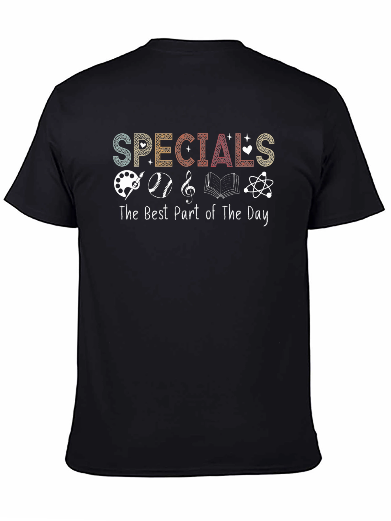 Show your love for special subjects with this unique T-shirt! This black tee features the word "SPECIALS" in playful, colorful lettering, accompanied by adorable icons representing art, baseball, music, reading, and science. Below the word, the phrase "The Best Part of The Day" is printed in a simple, elegant font. Perfect for any specials teacher or anyone who appreciates art, music, sports, and learning. Soft, comfortable, and stylish, this shirt is ideal for casual wear, school events, or just showing off your passion for education. A must-have addition to any teacher's wardrobe! Makes a perfect gift.