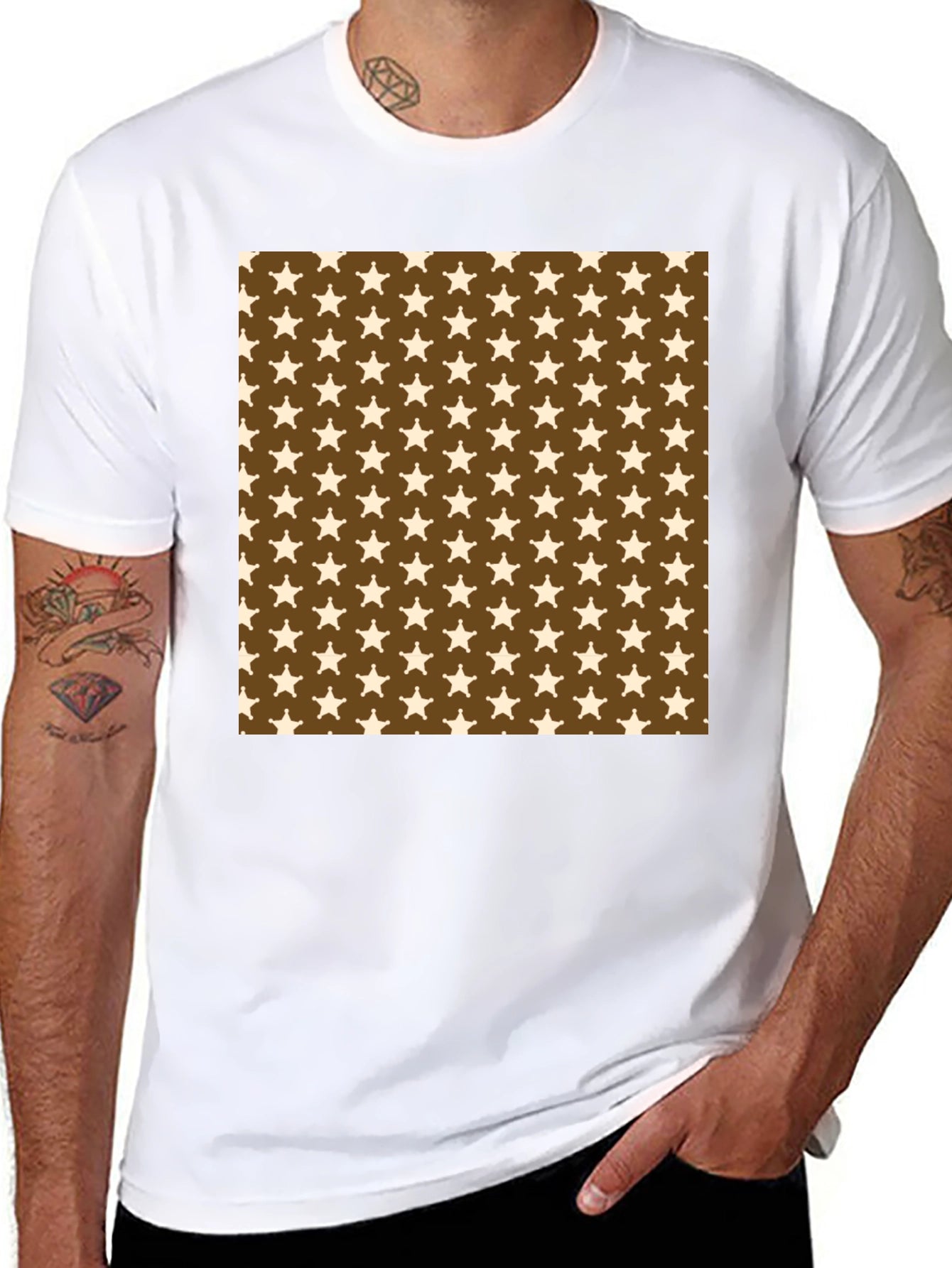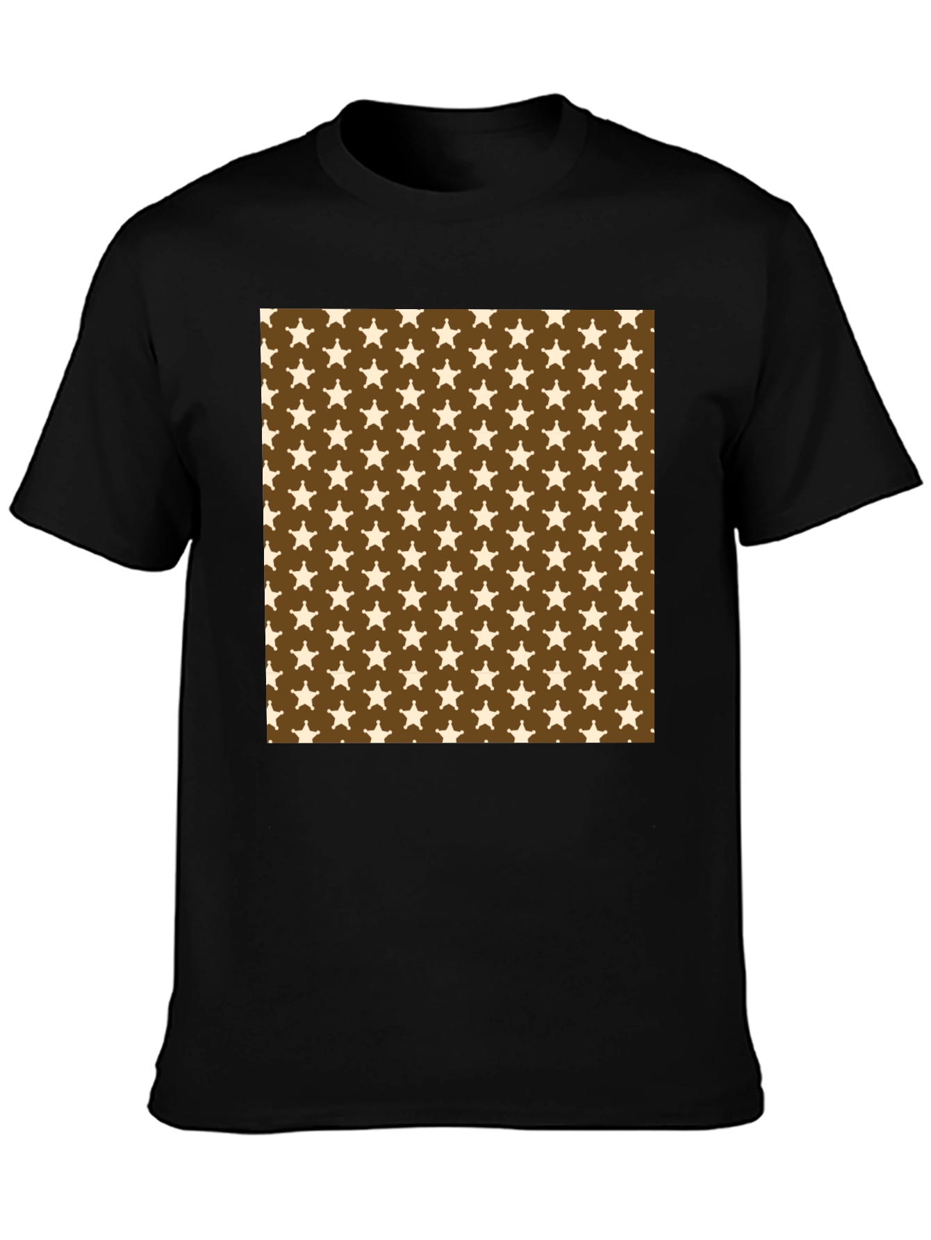 Show off your unique style with this eye-catching black t-shirt. The shirt features a distinctive pattern of white stars against a brown backdrop on the chest, adding a touch of flair to your casual wear. Made from comfortable material, this t-shirt is perfect for everyday wear. The classic fit makes it a versatile addition to any wardrobe. Whether you're hanging out with friends, or just relaxing at home, this t-shirt will keep you looking stylish and feeling great. Embrace the pattern and upgrade your wardrobe today!
